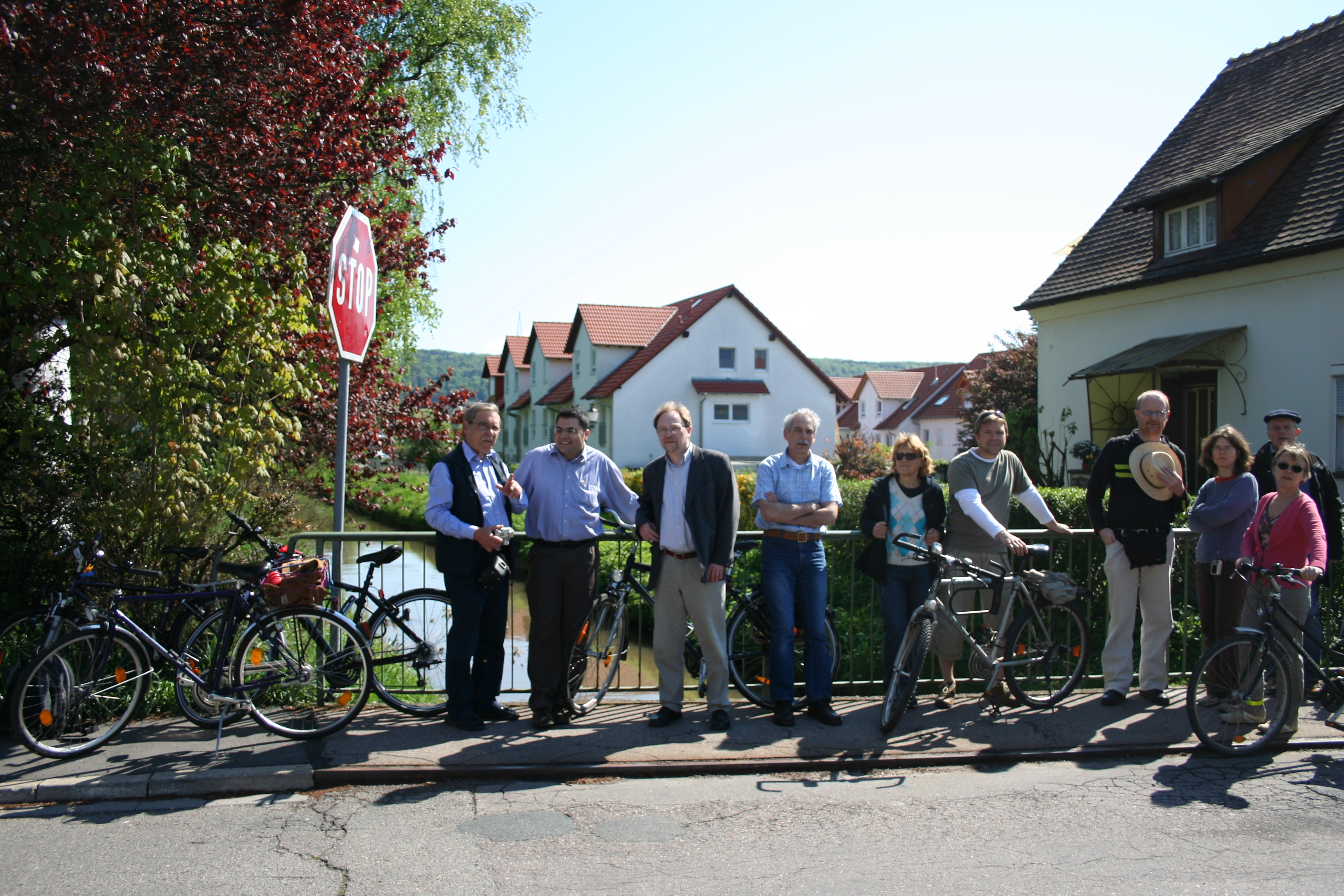 In Ortsmitte war auch hier die Sanierung Thema, insbesondere die Frage der Verkehrsführung und der Verkehrsraumgestaltung in der Theodor-Heuss Str. und der kleinen Bahnhofstraße. Das wenige Tage vorher vorgestellte Konzept des Stadtteilvereins fand große Zustimmung. Übers Bachgässl gings dann zum Leimbach, wo die Tieferlegung und Renaturierung besprochen wurde.